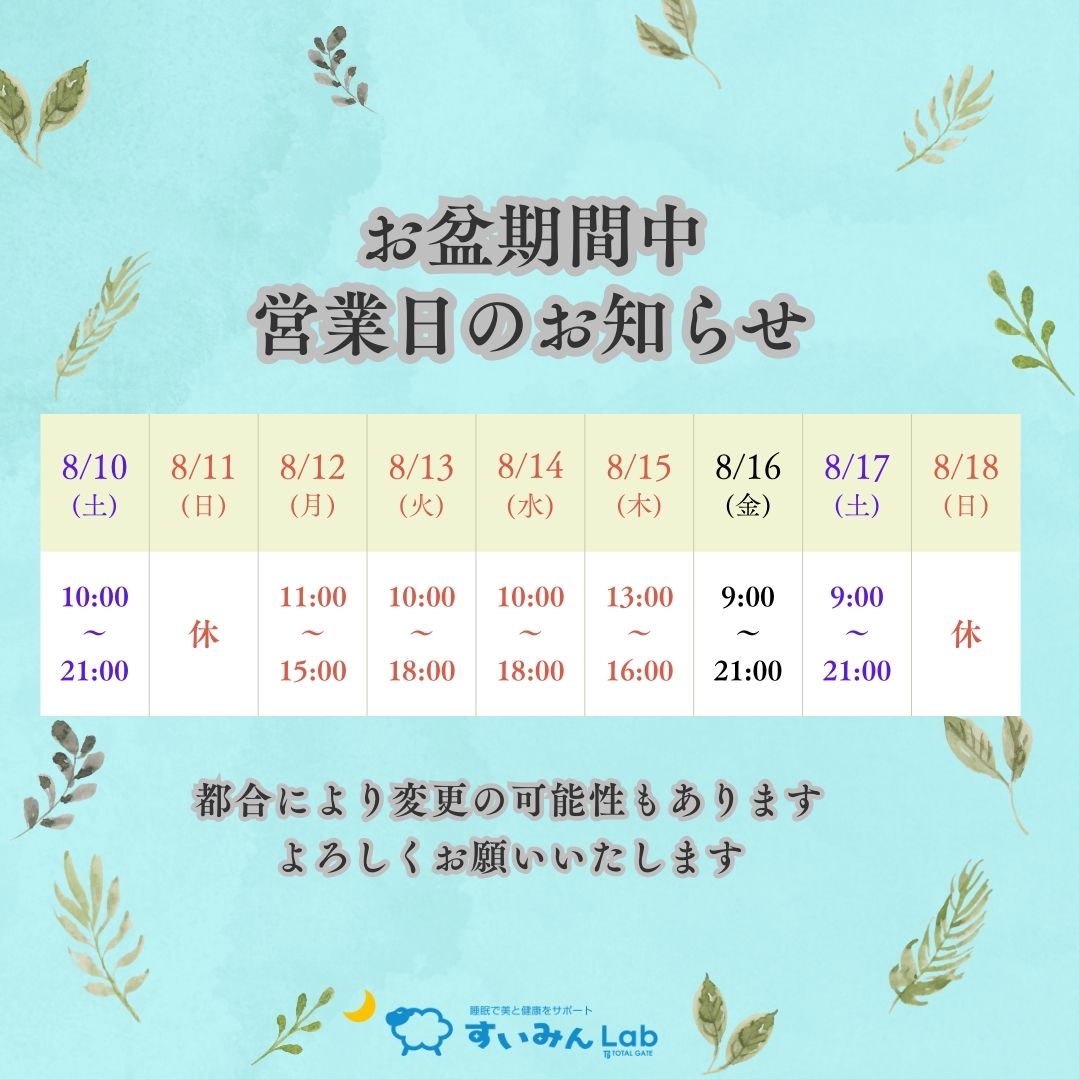 2024年08月09日 | お役立ち情報、お知らせいつもすいみんLabをご利用頂き、誠にありがとうございます。 お盆期間中の営業日について下記のとおりお知らせいたします。お客様にはご不便をお掛けいたしますがご理解のほどよろしくお願いいたします。